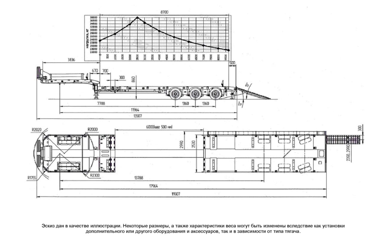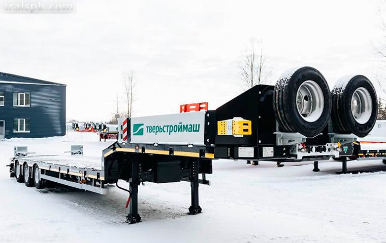 Трал Тверьстроймаш 99393E-S38 (G) с полезной нагрузкой до 38 тонн. В оснащение входят гидравлические аппарели, раздвижная платформа (до 6 м с шагом 500 мм). Перевозка в сцепке с тягачом Scania P340.