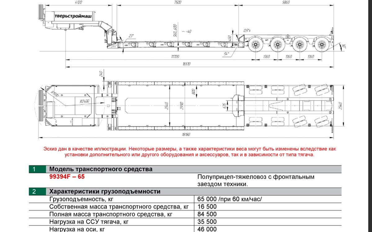 Низкорамный трал Тверьстроймаш 99394F-65 с грузоподъёмностью 65 тонн. Нераздвижной. Гусёк - отстегивающийся, для переднего заезда спецтехники. Перевозка в паре с тягачом марки Scania G480.