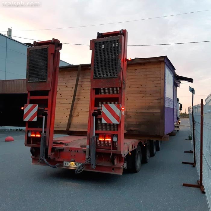 - Платформа низкорамного полуприцепа-тяжеловоза способна перевезти за один раз от двух и более стандартных бытовок.
